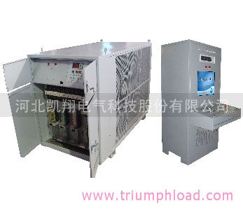 該系統(tǒng)分為自動(dòng)交流負(fù)載柜和中央控制臺(tái)兩部分。負(fù)載柜有兩個(gè)獨(dú)立回路,分別適用于380V和660V機(jī)車(chē)的發(fā)電機(jī)組輸出功率測(cè)試,兩套回路均由440KW的阻性負(fù)載和330KVA的感性負(fù)載組成,裝機(jī)總?cè)萘扛哌_(dá)1540KVA,每個(gè)回路有單獨(dú)的輸出端子和控制接口;中央控制臺(tái)集PC機(jī)、發(fā)電機(jī)組專(zhuān)用測(cè)試儀、控制面板于一體,智能化程度高,可自動(dòng)完成對(duì)發(fā)電機(jī)組所有電參數(shù)的專(zhuān)項(xiàng)測(cè)試,操作簡(jiǎn)單,數(shù)據(jù)采集準(zhǔn)確、效率高,滿(mǎn)足了機(jī)車(chē)發(fā)電機(jī)組的質(zhì)量檢測(cè)需求。