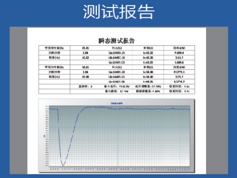 可進(jìn)行穩(wěn)態(tài)測(cè)試、瞬態(tài)測(cè)試(采樣間隔40us的突加突卸測(cè)試)、整定測(cè)試、波動(dòng)測(cè)試、諧波分析、錄波分析、生成測(cè)試報(bào)告。