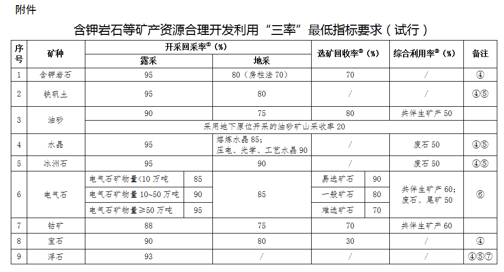 為強化含鉀巖石等礦產資源合理開發利用的監督管理,促進礦山企業節約與綜合利用礦產資源,依據《中華人民共和國礦產資源法》等法律法規,制定含鉀巖石等礦產資源合理開發利用“三率”最低指標要求(試行),現予以公告。