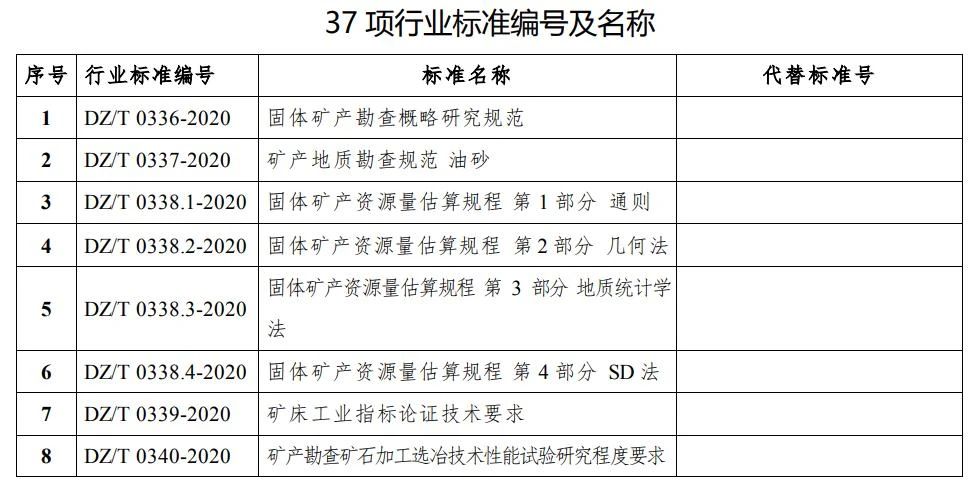 《固體礦產勘查概略研究規范》等37項行業標準和9項行業標準修改單已通過全國自然資源與國土空間規劃標準化技術委員會審查,現予批準、發布,并于發布之日起實施。編號及名稱見附件。